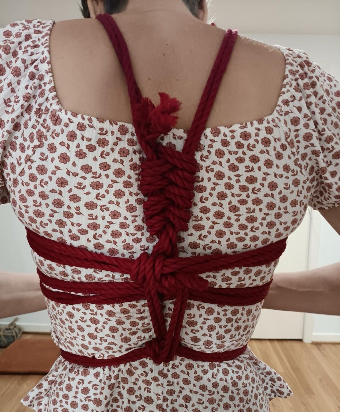 After we discussed and practiced communication for consent, the roping instruction began. As the rope bottom, I enthusiastically consented to both the man I trusted to handle the rope and the shibari master himself. With every round of knotted rope, I felt my arms tighten against my torso. The finished design transformed my torso into what looked like a decorative macramé plant hanger.
